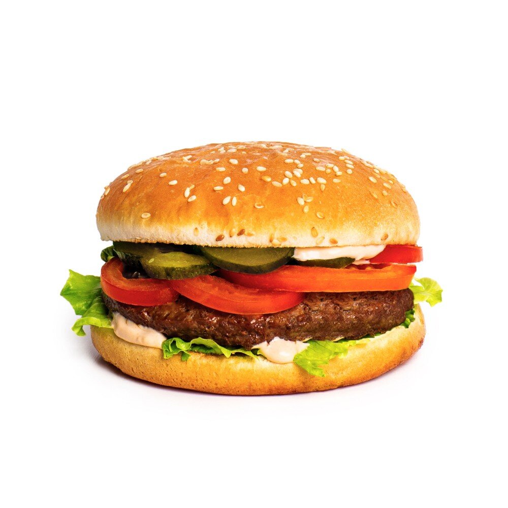 Котлета из 100% говядины, томаты, соленые огурцы, айсберг, соус бургер, булочка с кунжутом